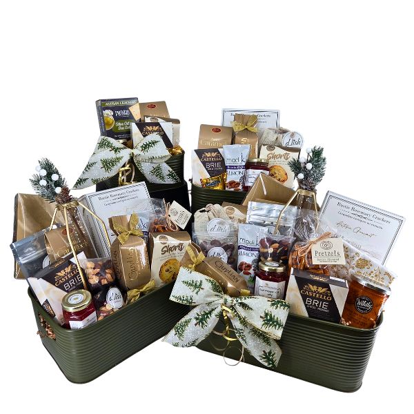 Another design that works well for group gifting is the Charming Winter design. Honour the whole team with one of these gifts. The large and extra large sizes feature a bud vase that can compliment your holiday decor. Filled to the brim with items such as Brie, butter pretzels, roasted red pepper jelly, smoked almonds, truffles, chocolates, and more.