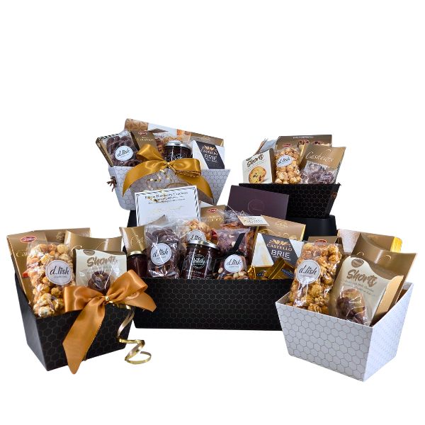 Our Elegant Sharable design is full of delicious sweet and savoury items. Chocolate caramel popcorn, Brie, Bruscetta, gourmet crackers, truffles, caramels, nuts, pretzels, cookies and more! What a great way to thank a group of people and gift them a bit of appreciation leading up to the holidays. With four different sizes this design can be the perfect fit for your group!